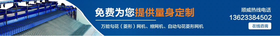 安平縣順威絲網(wǎng)機(jī)械設(shè)備制造有限公司自產(chǎn)自銷,省去中間環(huán)節(jié),讓利給客戶,真正的讓您省錢。主要產(chǎn)品有:萬能勾花(菱形)網(wǎng)機(jī)、縮網(wǎng)機(jī)、自動勾花菱形網(wǎng)機(jī)、全自動勾花菱形網(wǎng)機(jī)。 |
